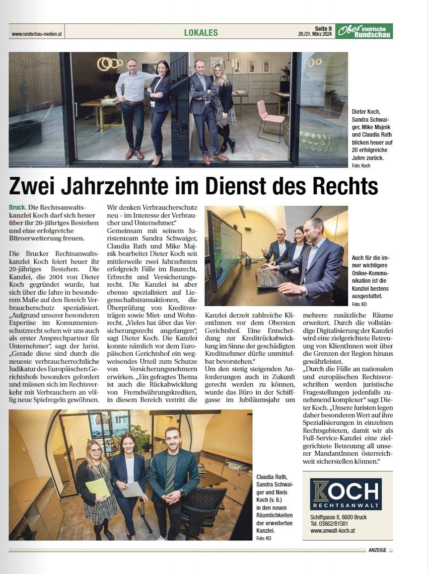 Zum 20-jährigen Bestehen der Rechtsanwaltskanzlei Koch widmete uns die Obersteirische Rundschau einen Bericht über unsere Tätigkeit im Bereich Verbraucherschutz.